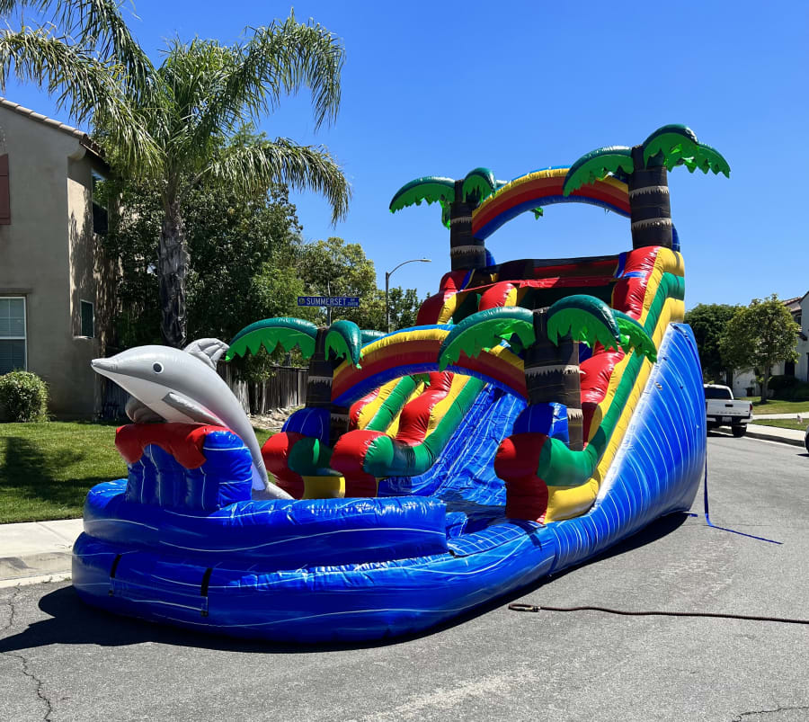 Introducing the "Jamaican Me Crazy" inflatable water slide – an exhilarating splash of tropical fun brought to you by So Cal Party Plug Jumpers. Standing tall with vibrant hues of blue marble, and palm green, this slide transports you straight to the Caribbean shores. Its towering height guarantees a heart-pounding descent into a refreshing pool, while the meticulously crafted palm trees adorn the slide, creating an irresistible island atmosphere. Whether it's a sizzling summer celebration, a birthday bash, or a corporate event, the "Jamaican Me Crazy" water slide promises non-stop laughter and unforgettable memories for all ages. Get ready to slide, splash, and savor the island vibe – it's a tropical fiesta waiting to happen!