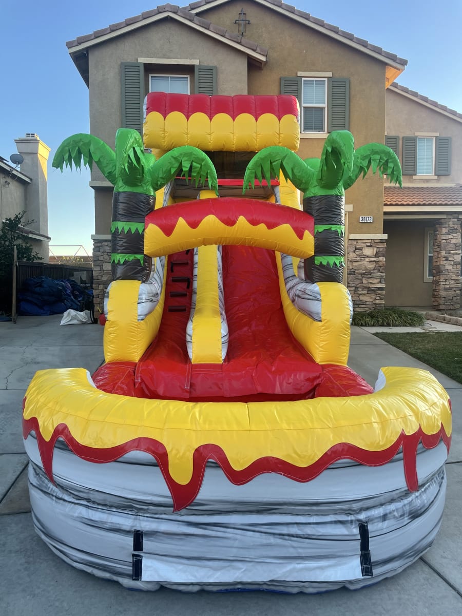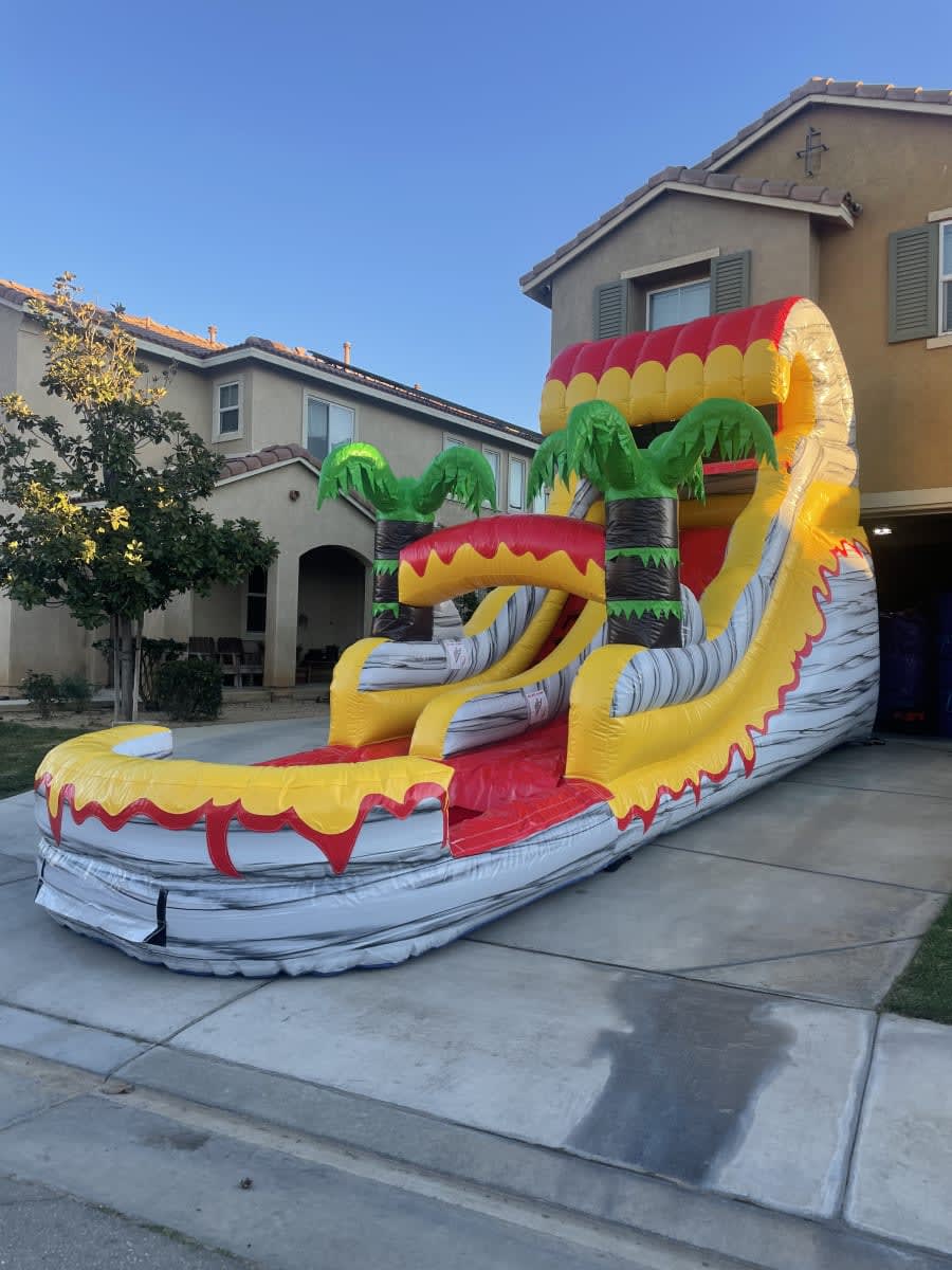 Get ready to fiesta like never before with our spectacular Fiesta Falls Water Slide! Standing tall at an impressive 15 feet and spanning 27 feet in length, this exhilarating water slide is the ultimate way to beat the heat and create memories that will last a lifetime. Whether you're hosting a birthday party, a family gathering, or any festive celebration, the Fiesta Falls Water Slide guarantees non-stop fun and excitement. As the sun shines down, prepare to embark on an aquatic adventure that will leave you and your guests breathless with delight. Climb to the top of the slide, feeling the anticipation building with every step.